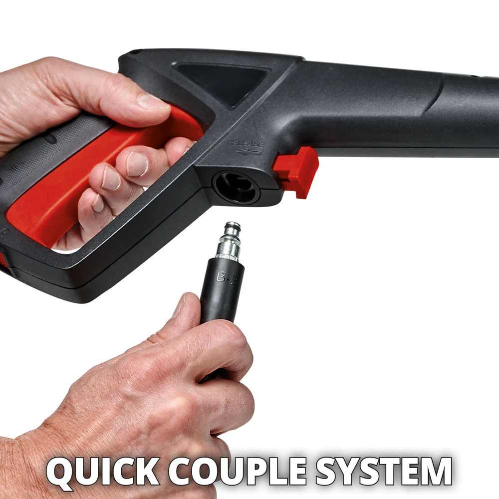 For flexibility in use the high-pressure cleaner has a modular Quick-Couple-system and the pressure and strength of the water jet are regulated by the nozzles. There are also versatile storage options for the nozzles, gun and other accessories.