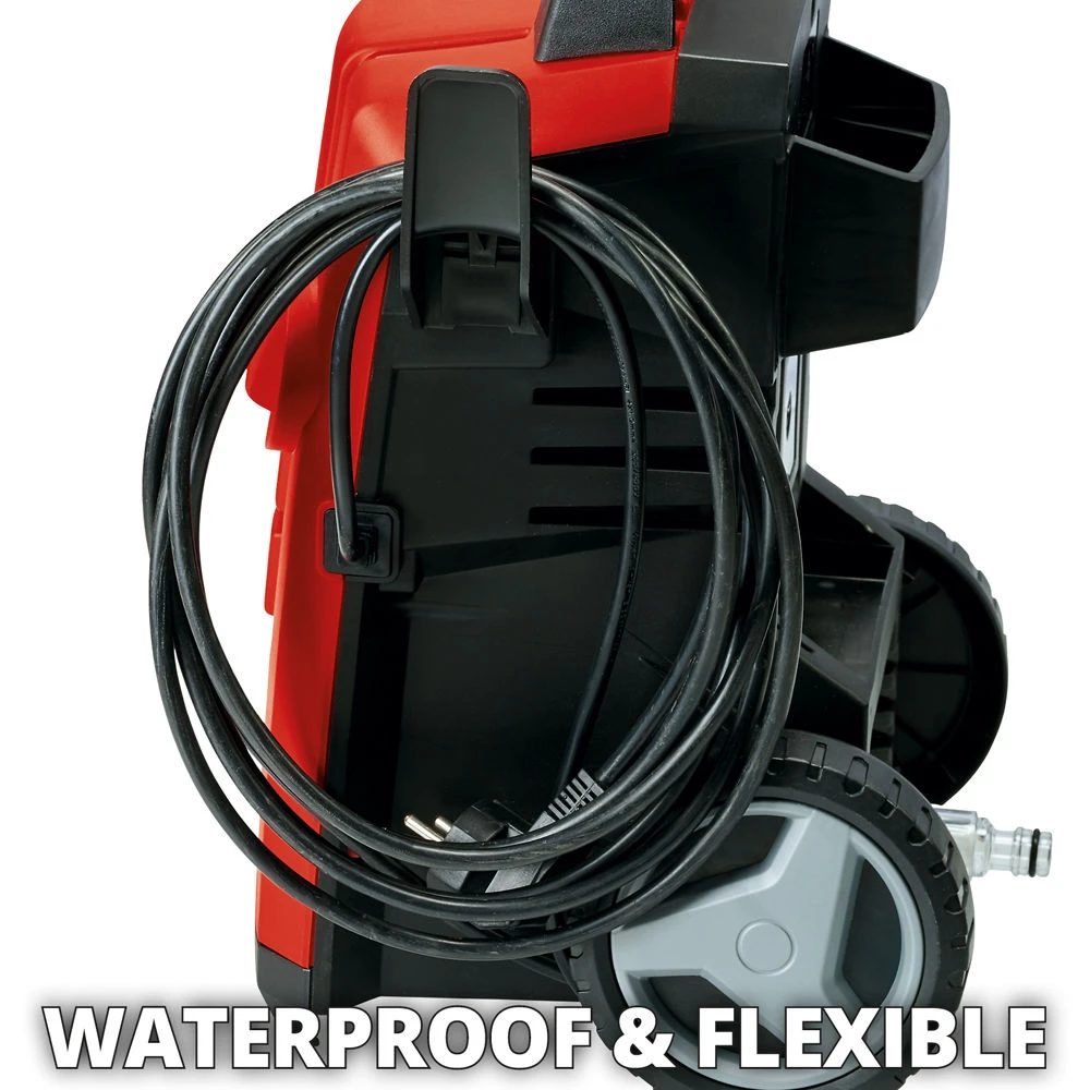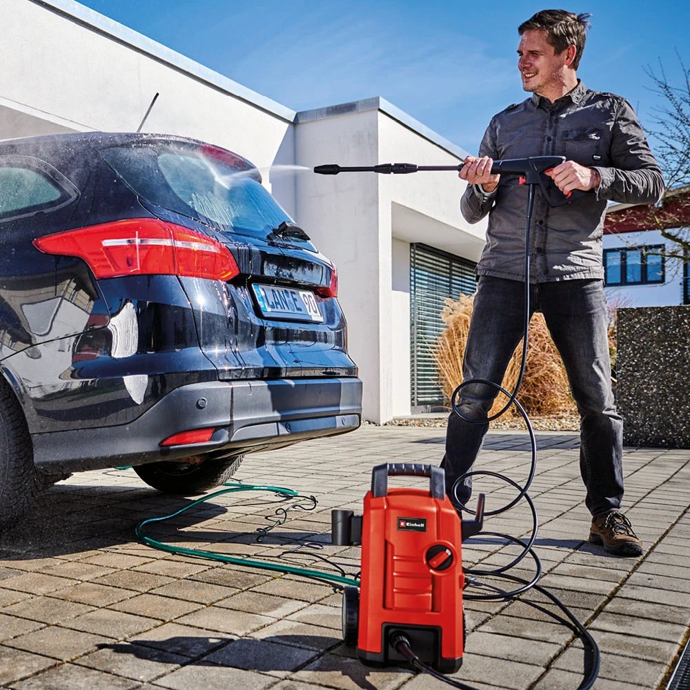 The Einhell TC-HP 130 high-pressure cleaner has a power rating of 1500 W and operates at high pressure. Thanks to the small, compact design and integrated central carry-handle the high-pressure cleaner is easy to work with and saves space when stowed away. The pressure washer switches on and off automatically and, being low in weight, is ideal for mobile use and is suitable for getting lightly soiled surfaces cleaned quickly.