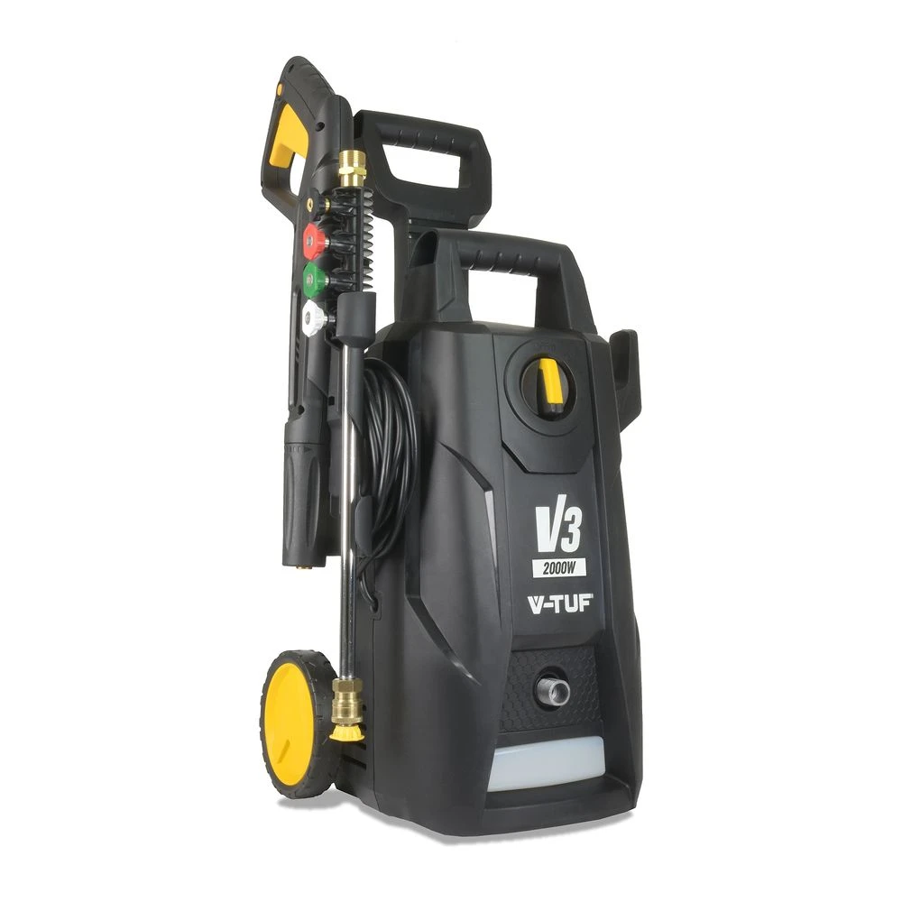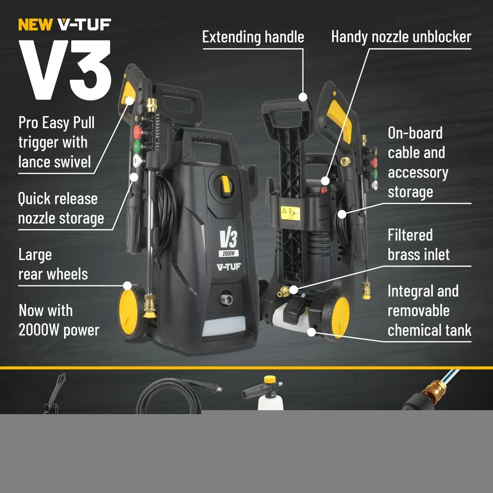 V-TUF V3 boasts a maximum pressure of 2175psi, 2000 Watt motor, self-priming pump, integral chemical tank with injection and application function, Quick release Nozzle system including a Turbo nozzle, Patio Cleaner, Foamer cannon, Quick Release accessories – making it compact, powerful and portable – all you need is a good water supply.