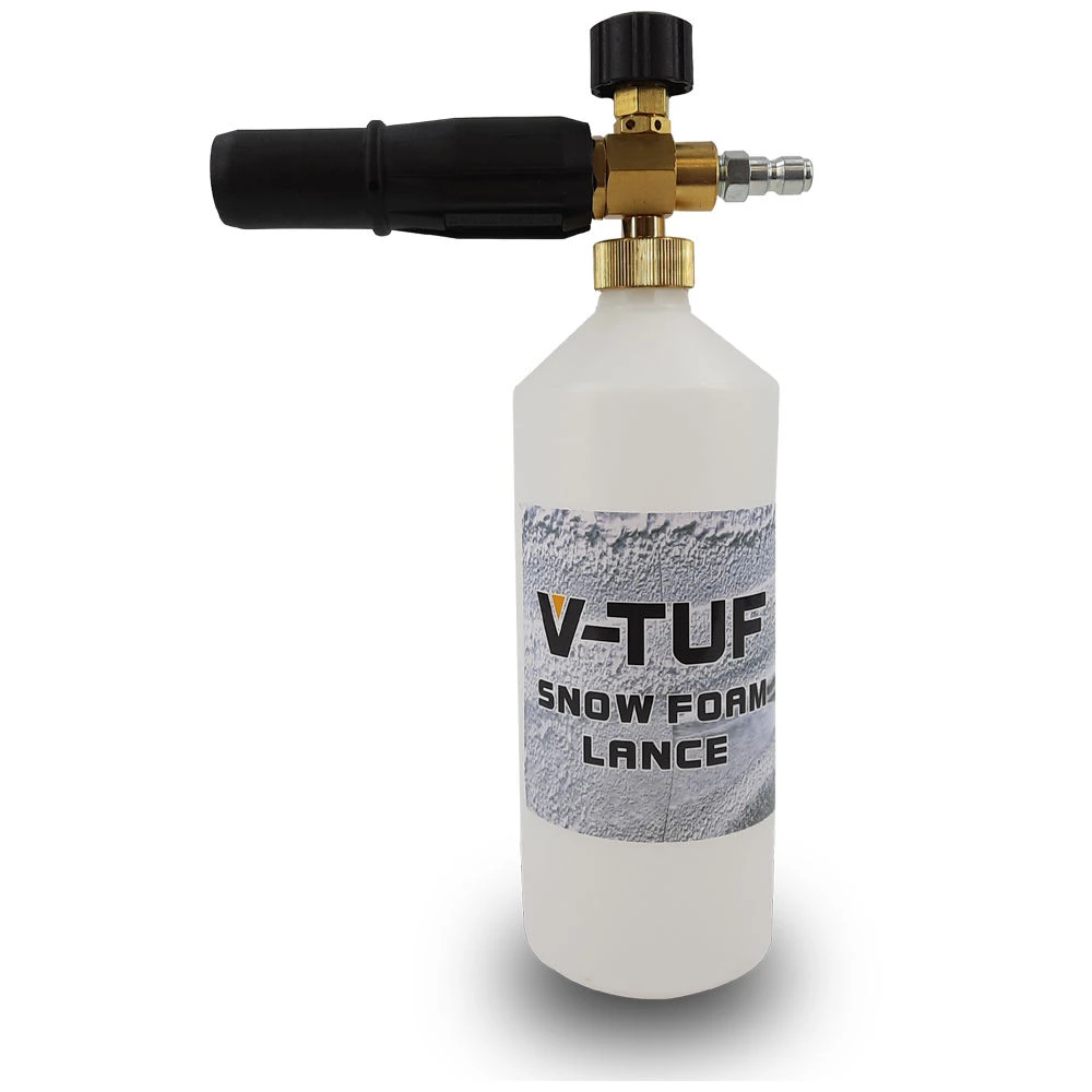 V-TUF Foam Cannon that quickly couples to the end of your lance giving you instant foam because it doesn’t have to travel down the hose. Snow foams gives the detergent an even spread and a longer curing time. Meaning the detergent has more time to do the work. It is also easier to see the areas you might have missed.