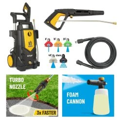 Although very affordable, the V5 boasts a Maximum Pressure of 2390psi, 2100 Watt Brushless Induction Motor, Self-priming pump, Integral chemical tank with injection and application function, 5x Quick release Nozzle system including a Turbo nozzle, Industrial Type accessories – Ease to use and reliable.